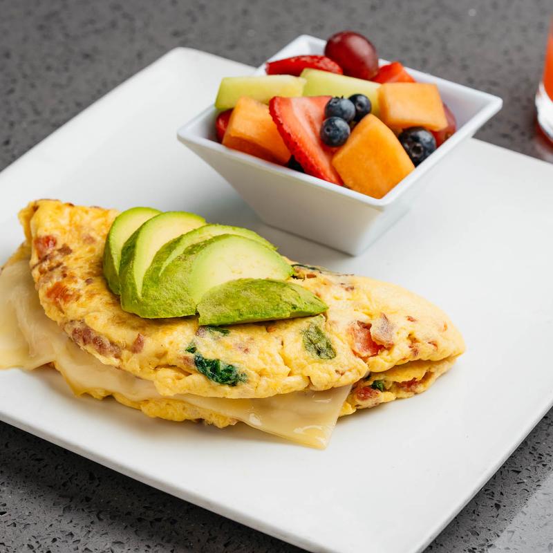 and pico de gallo. Served with two eggs your way and fresh fruits